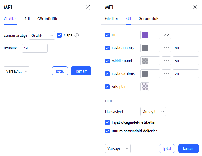 MFI göstergesinin grafik zaman aralığı, MFI uzunluğu, aşırı alım, aşırı satım ve orta seviye değerlerini kullandığımız platformda sunulan arayüz pencerelerinden değiştirebiliriz: