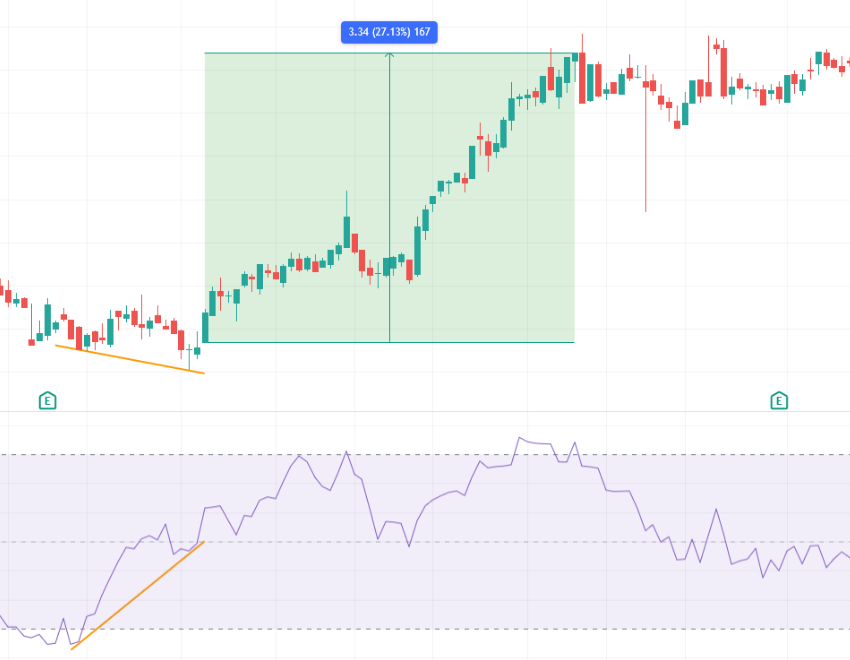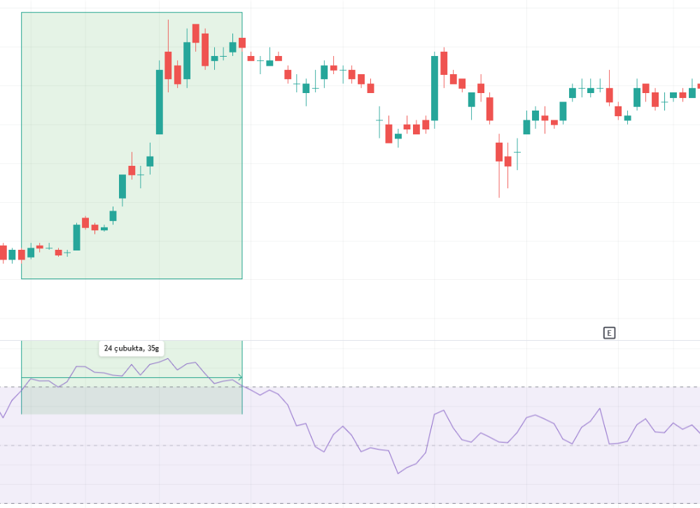 Bir hisse fiyatının, aşırı alım çizgisinin üzerine çıkacağı veya aşırı satış çizgilerinin aşağısına geçeceği kesin bir durum değildir. Aşağıdaki günlük grafikte, 34 gün boyunca, yükseliş trendi nedeniyle, aşırı alım çizgisi olan 80 değerinin altına düşmemiş bir hissenin fiyat hareketleri görülmektedir: