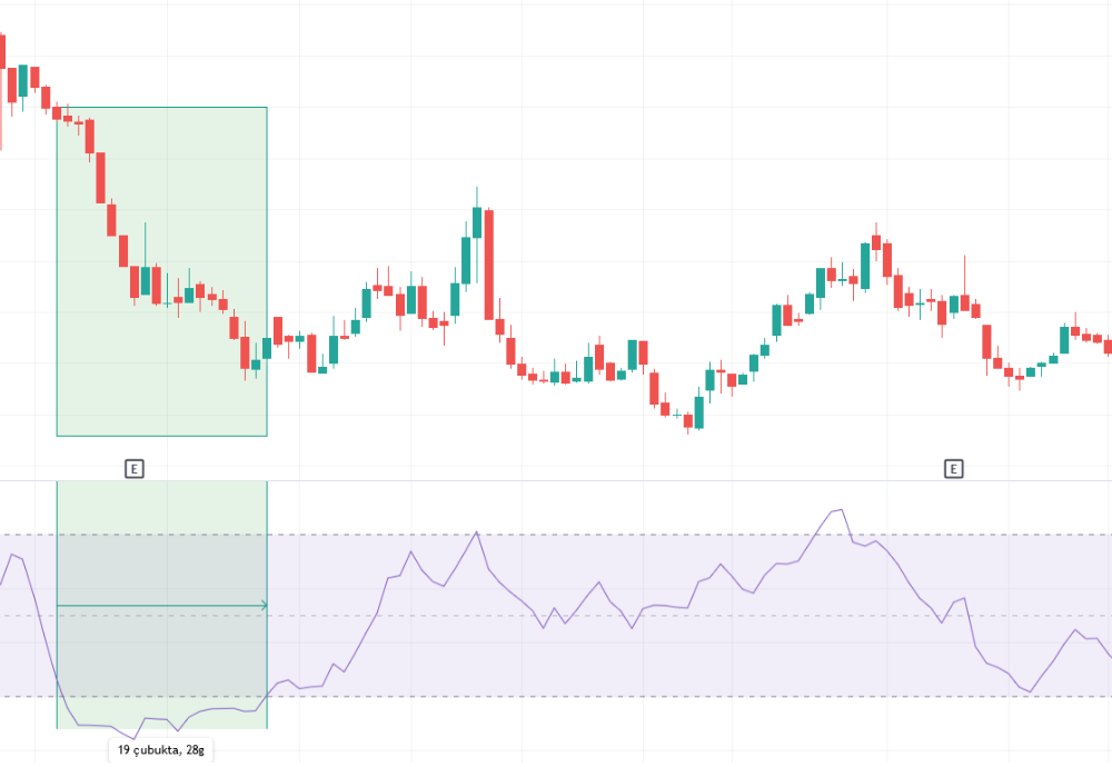 Aşağıdaki günlük grafikte, 28 gün boyunca, düşüş trendi nedeniyle, aşırı satış çizgisi olan 20 değerinin üstüne çıkmamış bir hissenin fiyat hareketleri görülmektedir: