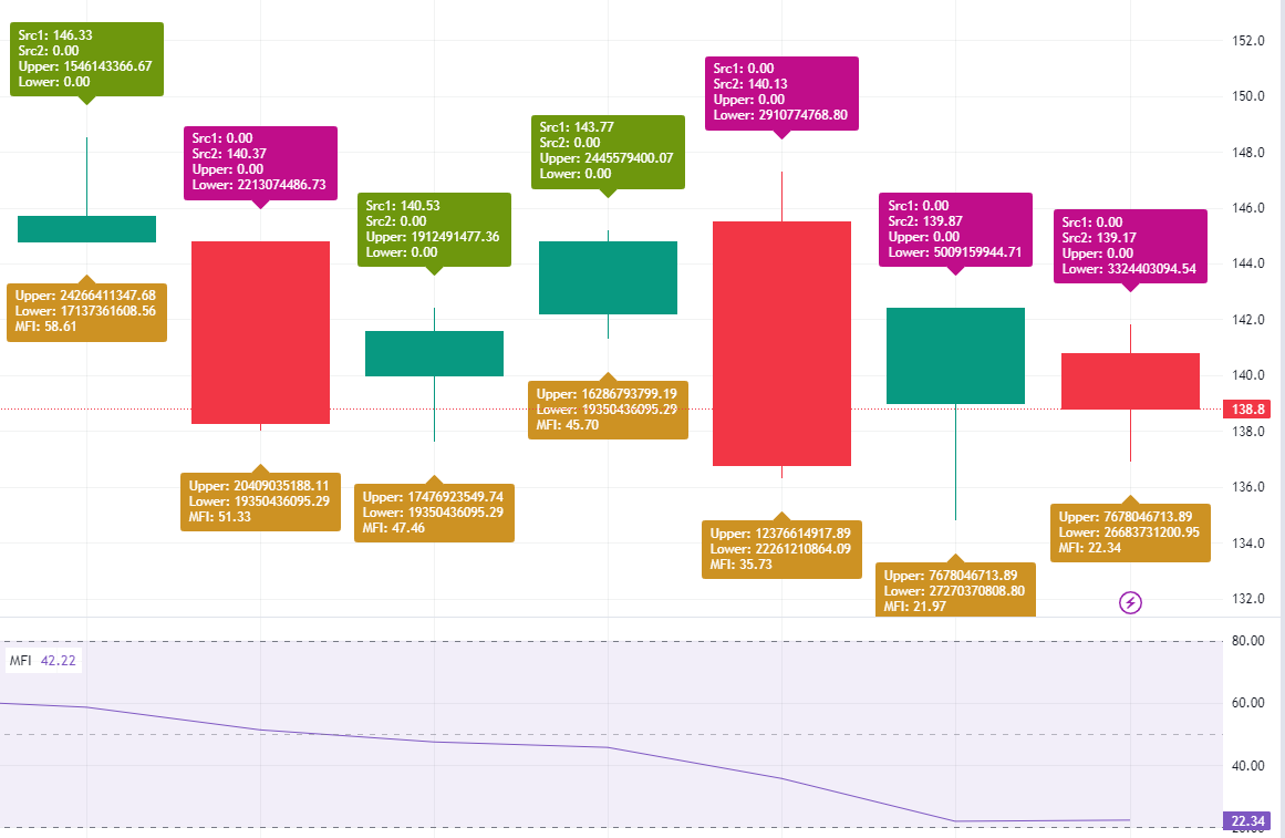 Aşağıdaki grafikte, her bar için kaynak değerleri, üst ve alt değerler barın üstündeki kutucuğa, aktif bardan başlamak üzere, geçmiş 14 barın üst ve alt değerlerinin toplamı ve MFI değeri barın altındaki kutucuğa yazılmıştır.