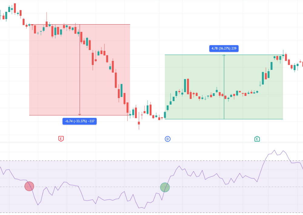 Aşağıdaki grafikte, MFI çizgisi 50 değerini aşağı doğru keserek altına geçtiği noktalardan sonra hisse fiyatının düşüş trendinin devam ettiği, MFI grafiğinde daire fiyat grafiğinde ise dikdörtgen şeklinde kırmızı renkle işaretlenmiştir. MFI çizgisi 50 değerini yukarı doğru keserek üzerine geçtiği noktadan sonra hisse fiyatının yükseliş trendinin devam ettiği, MFI grafiğinde daire fiyat grafiğinde ise dikdörtgen şeklinde yeşil renkle işaretlenmiştir.