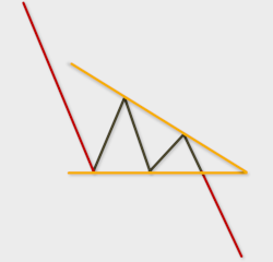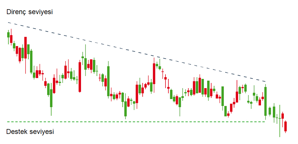 Düşen bir trend esnasında, fiyatlar belirli bir destekle karşılaşır. Desteği kıramayarak yukarı yönlü hareket eder. Daha sonra yukarıdaki dirençten tekrar aşağı yönelir. Aynı destek seviyesini tekrar test ederek kıramaz ve yine yukarı yönlü harekete başlar. Bu döngüyü bir müddet bu şekilde sürdürebilir. Ancak, hacimdeki azalmadan dolayı gittikçe yukarı yönlü hareketin boyu kısalır. Böylece sıkışan fiyat hareketleri grafikte alçalan bir üçgene benzeyen şekil oluşturur.