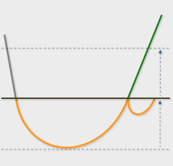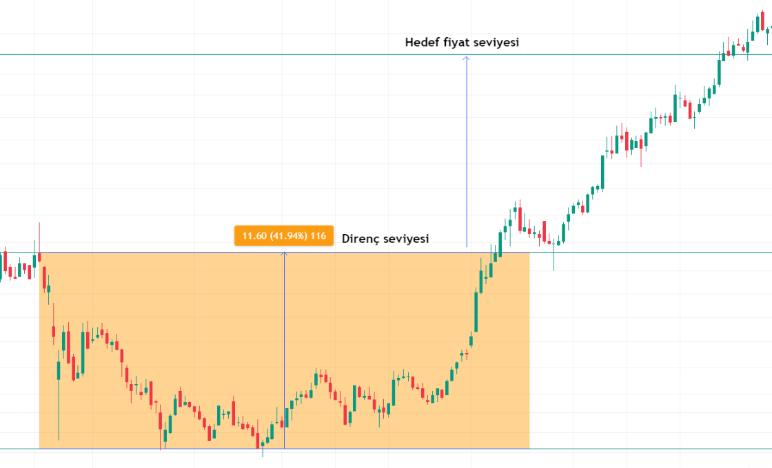 Dip seviyesinden direnç çizgisine bir doğru çizilerek formasyonun yüksekliği ölçülür. Formasyonun tamamlanması durumunda fiyatların boyun çizgisinden formasyon yüksekliği kadar daha yükseleceği kabul edilir.