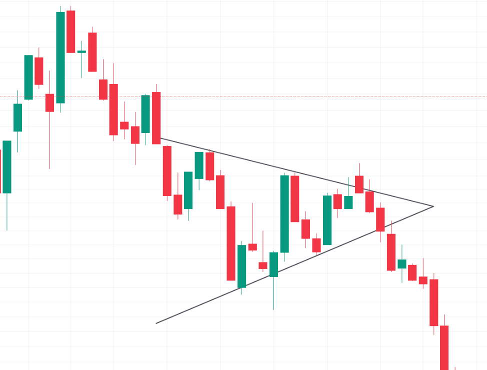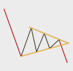 Fiyat hareketleri düşen bir trendin içerisinde düzeltme isteğiyle geçici bir müddet yükseliş eğilimine girerek aşağıda daha yüksek dipler yukarıda ise daha düşük tepeler yapar. Tepelerdeki düşüş oranı diplerdeki yükseliş oranıyla simetriktir. İşlem hacminde azalma görülür. Böylece, sıkışan fiyat hareketleri grafikte simetrik bir üçgene benzeyen ters flama oluşturur.