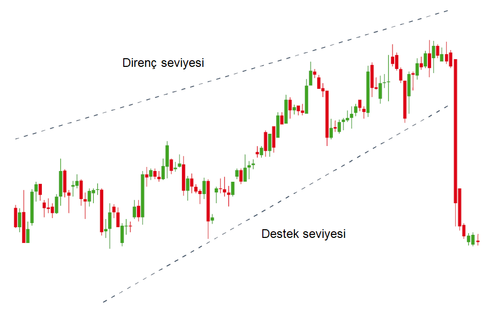 Yükselen kama formasyonu genellikle fiyatın düşeceğini ve destek seviyesinin kırılacağını gösterir.