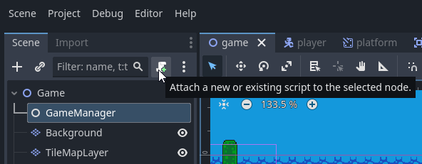3. While "game" Scene and "GameManager" Node are selected, click on the "Attach a new or existing script to selected node" button.