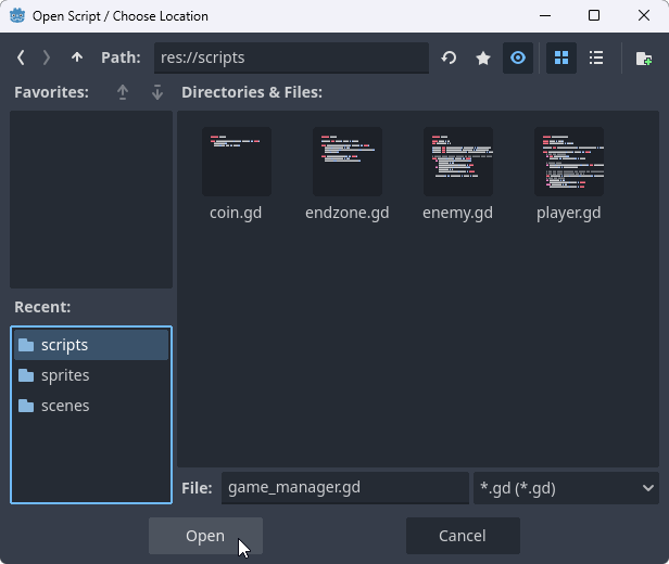 5. In the window that opens, go to the "scripts" directory, select the "game_manager.gd" file and click the "Open" button.
