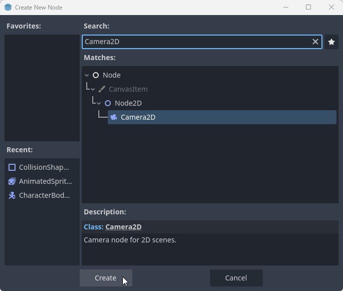 2. In the Create New Node window that appears, search for and select Camera2D in the Search line and click on the Create button.