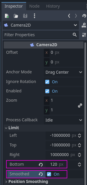 2. Change the "Bottom" value to 120 in the "Limit" line under the "Inspector" tab. Check the "Smoothed" On box. The value of 120 is the distance from the horizontal center line of the scene to the bottom of the tiles. This value is measured with the "Ruler Mode" button.