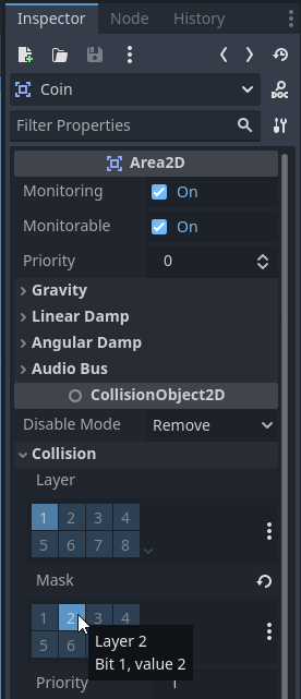 11. While "coin" Scenes and "Coin" Node are selected, under the "Inspector" tab, in the "Collision" row, select the value 2 from the "Mask" table.