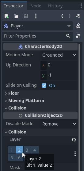 10. With "player" Scenes and "Player" Node selected, under the "Inspector" tab, in the "Collision" row, select the value 2 from the "Layer" table.