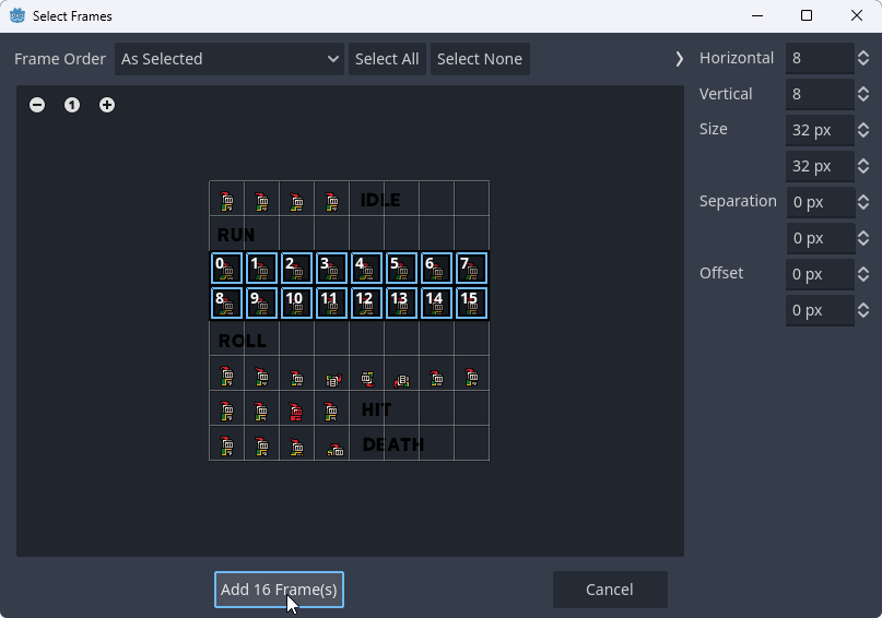 10. While "run" is selected, select the "knight.png" file in the "assets/sprites" directory with the "Add frames from sprite sheet" button.