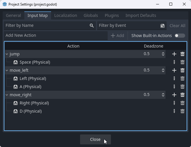5. Repeat the same process twice for the "move_right" line, select the right arrow and D keys and click the "Close" button.