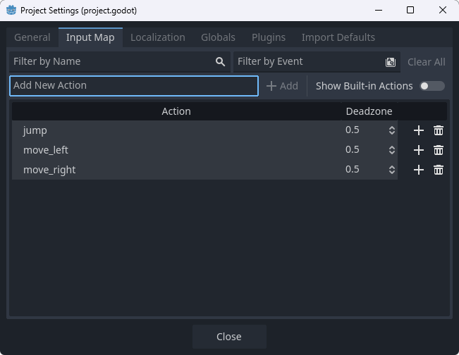 Moving left and right and jumping of Player is an Action. We can use these actions by assigning a key to them.