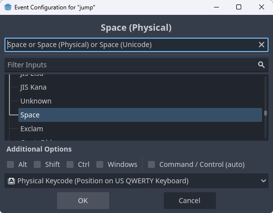 3. Click the + button to the right of the "jump" line. While in the box at the top of the window that opens, select the Space key by pressing the Space key and click the "OK" button.