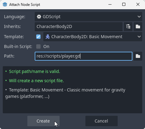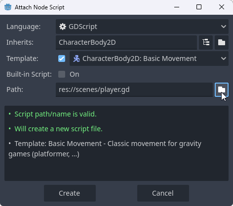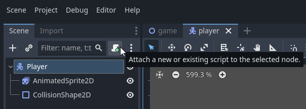 1. Select the Player scene. While the Player Node is selected, click the second button from the right in the row under "Scene" to create a new script or connect an existing script to the selected Node.