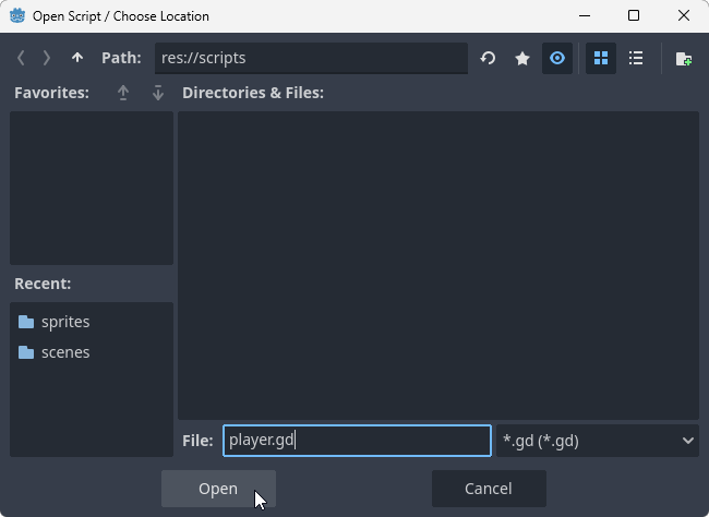 3. After opening the "scripts" directory in the window that opens, open the "player.gd" file by clicking the "Open" button.