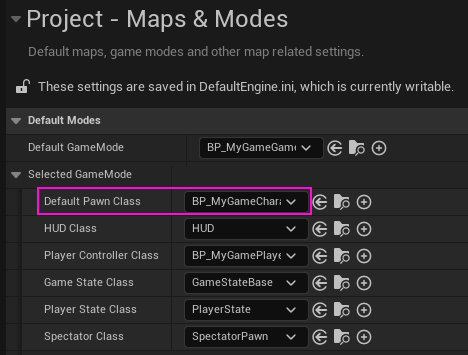 Unreal Engine Editor'ün "Project Settings" penceresinin "Maps & Modes" sekmesinde, "Default Pawn Class" değerini "BP_MyGameCharacter" olarak değiştirelim.