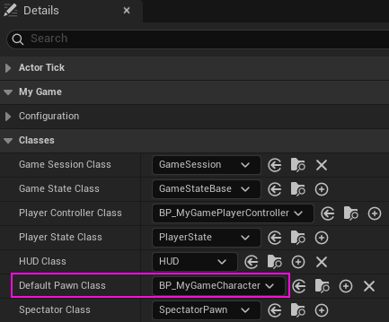 ⚠️ Yukarıdaki işlemi yaptığımızda, "BP_MyGameGameMode" sınıfının Details sekmesindeki "Default Pawn Class" değeri otomatik olarak "BP_MyGameCharacter" olarak değişir. Aynı şekilde, "BP_MyGameGameMode" sınıfının Details sekmesindeki "Default Pawn Class" değerini değiştirdiğimizde, "Project Settings" penceresinin "Maps & Modes" sekmesindeki "Default Pawn Class" değeri de otomatik olarak değişir.