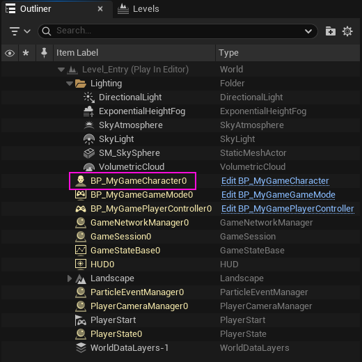 1. "BP_MyGameCharacter" sınıfı aktif Character olarak devreye girer ve Outliner'a görünür.