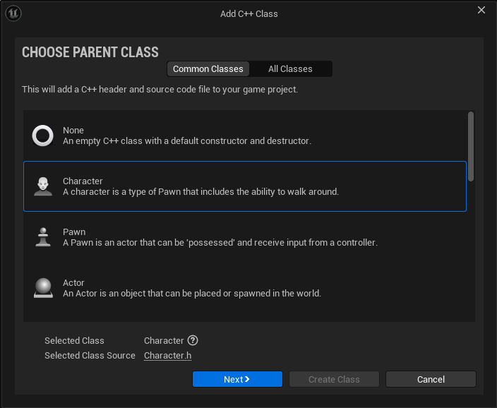 1. Unreal Engine Editor'da, ana menüden "Tools - New C++ Class" seçeneği ile açılan "Add C++ Class" penceresinde "Character" seçeneği seçili iken, "Next" butonuna tıklayalım.