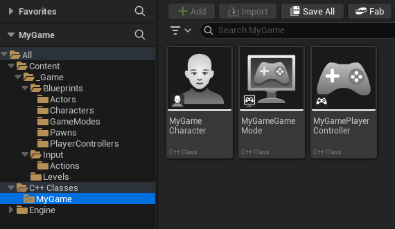 4. Kodlar derlendikten sonra "C++ Classes/MyGame" dizini altında "MyGameCharacter" adlı bir dosya otomatik olarak oluşturulacaktır.