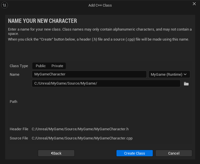2. Açılan pencerede "Name" satırına "MyGameCharacter" değerini girdikten sonra "Create Class" butonuna tıklayarak Character sınıfını oluşturalım.