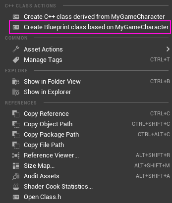 1. "MyGameCharacter" sınıfına sağ tıkladığımızda açılan menüden, "Create Blueprint class based on MyGameCharacter" seçeneğine tıklayarak "Add Blueprint Class" penceresini açalım.