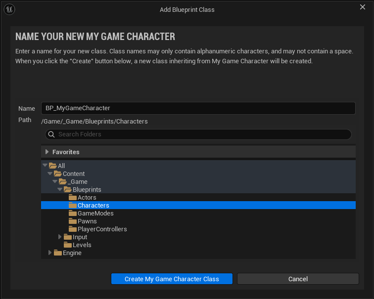 2. "Name" satırına "BP_MyGameCharacter" değerini girdikten ve "Path" bölümünde "Content\_Game\Blueprints\Characters" dizinini seçtikten sonra "Create My Game Character Class" butonuna tıklayarak Blueprint sınıfını oluşturalım.
