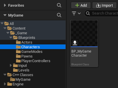 3. İşlem tamamlandığında, "Content\_Game\Blueprints\Characters" dizininde "BP_MyGameCharacter" sınıfı oluşturulur.