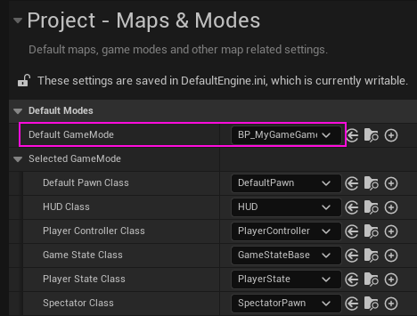 Unreal Engine Editor'ün "Edit - Project Settings" menü seçeneği ile erişilen "Project Settings" penceresinin "Maps & Modes" sekmesinde, "Default GameMode" değerini "BP_MyGameGameMode" olarak değiştirelim. "Default Pawn Class" ve "Player Controller Class" değerleri şimdilik aynı kalacaktır.
