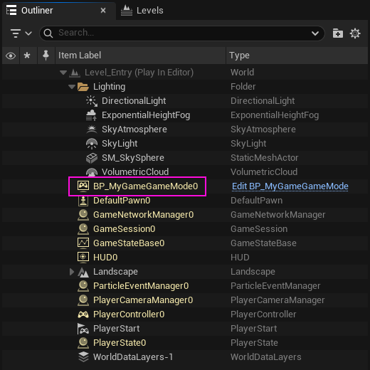 1. "BP_MyGameGameMode" sınıfı aktif GameMode olarak devreye girer ve Outliner'a görünür.