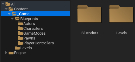 2. "_Game" dizini altında "Blueprints" adlı bir dizin ve bu dizin altında aşağıdaki dizinleri oluşturalım.