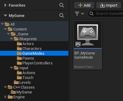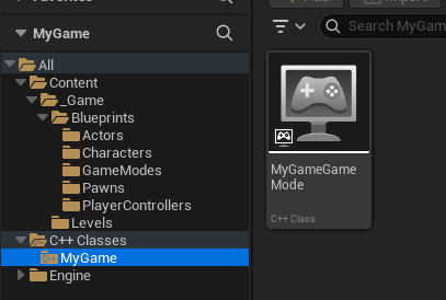 3. İşlem tamamlandığında, "Content\_Game\Blueprints\GameModes" dizininde "BP_MyGameGameMode" sınıfı oluşturulur.