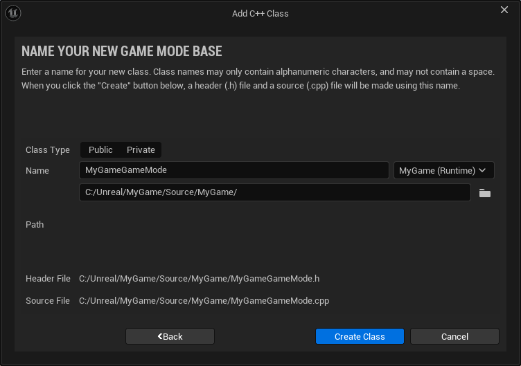 2. Açılan pencerede "Name" satırına "MyGameGameMode" değerini girdikten sonra "Create Class" butonuna tıklayarak GameMode sınıfını oluşturalım.