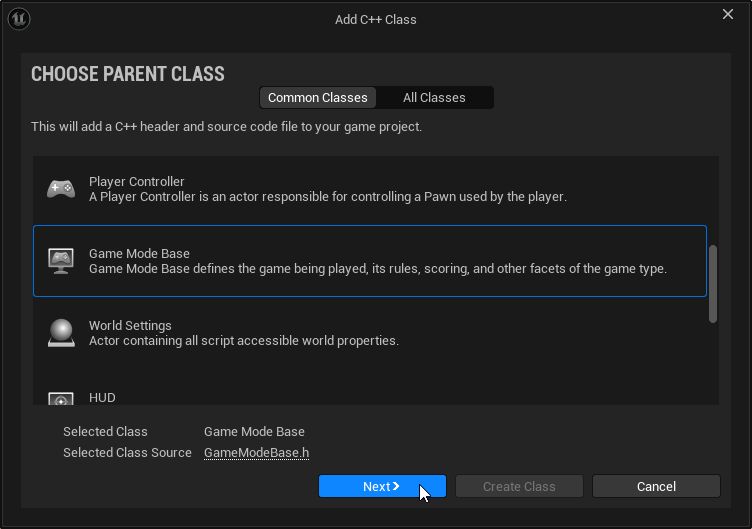 1. Unreal Engine Editor'da, ana menüden "Tools - New C++ Class" seçeneği ile açılan "Add C++ Class" penceresinde "Game Mode Base" seçeneği seçili iken, "Next" butonuna tıklayalım.