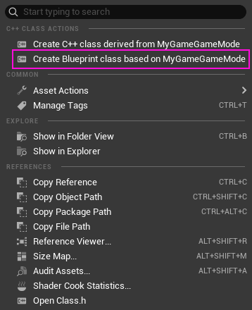 1. "MyGameGameMode" sınıfına sağ tıkladığımızda açılan menüden, "Create Blueprint class based on MyGameGameMode" seçeneğine tıklayarak "Add Blueprint Class" penceresini açalım.