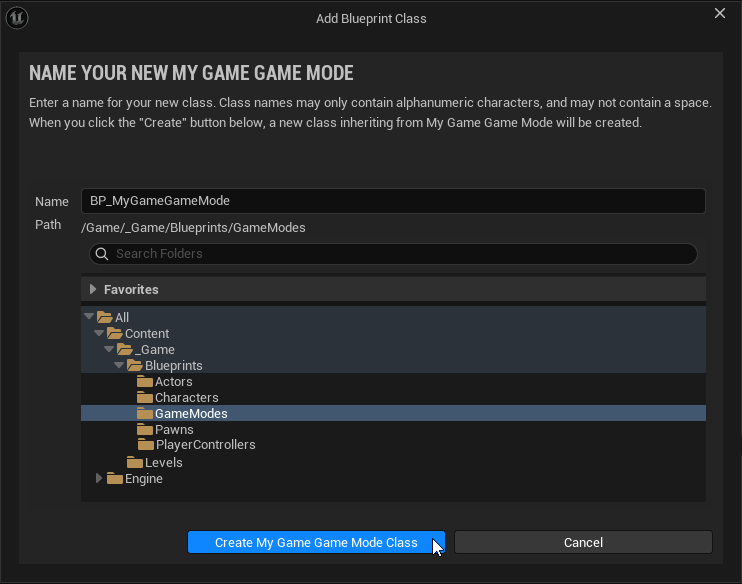 2. "Name" satırına "BP_MyGameGameMode" değerini girdikten ve "Path" bölümünde "Content\_Game\Blueprints\GameModes" dizinini seçtikten sonra "Create My Game Game Mode Class" butonuna tıklayarak Blueprint sınıfını oluşturalım.