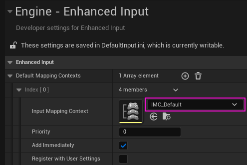 3."Editor -> Project Settings..." penceresinde "Engine -> Enhanced Input" sekmesinde "Default Mapping Contexts -> Input Mapping Context" kutusuna "IMC_Default" değerini atayalım.