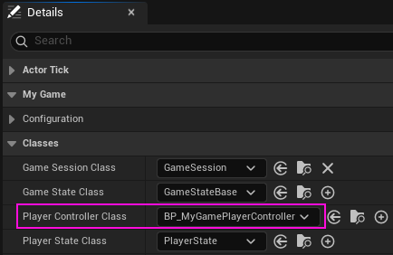 ⚠️ Yukarıdaki işlemi yaptığımızda, "BP_MyGameGameMode" sınıfının Details sekmesindeki "Player Controller Class" değeri otomatik olarak "BP_MyGamePlayerController" olarak değişir. Aynı şekilde, "BP_MyGameGameMode" sınıfının Details sekmesindeki "Player Controller Class" değerini değiştirdiğimizde, "Project Settings" penceresinin "Maps & Modes" sekmesindeki "Player Controller Class" değeri de otomatik olarak değişir.