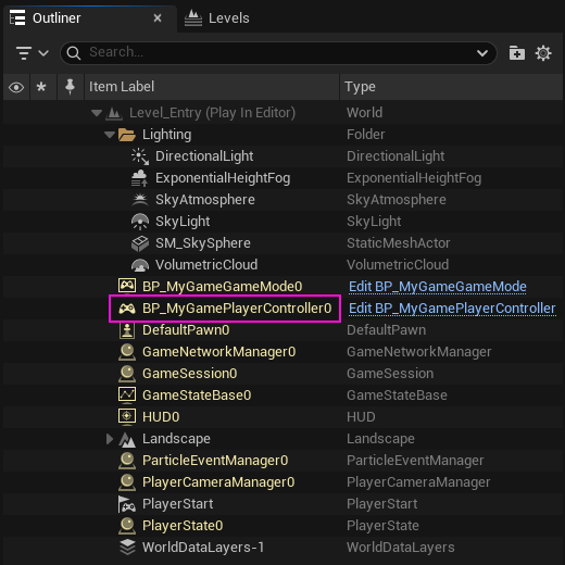 1. "BP_MyGamePlayerController" sınıfı aktif PlayerController olarak devreye girer ve Outliner'a görünür.