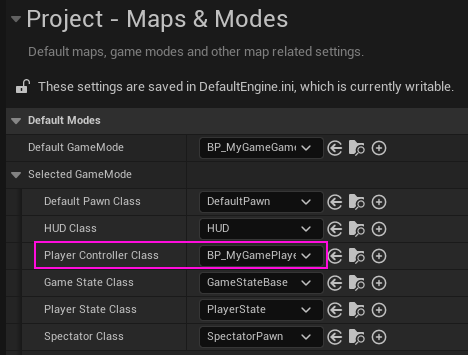 Unreal Engine Editor'ün "Project Settings" penceresinin "Maps & Modes" sekmesinde, "Player Controller Class" değerini "BP_MyGamePlayerController" olarak değiştirelim. "Default Pawn Class" değeri şimdilik aynı kalacaktır.