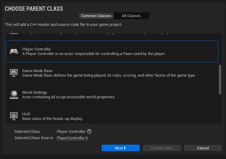 1. Unreal Engine Editor'da, ana menüden "Tools - New C++ Class" seçeneği ile açılan "Add C++ Class" penceresinde "Player Controller" seçeneği seçili iken, "Next" butonuna tıklayalım.