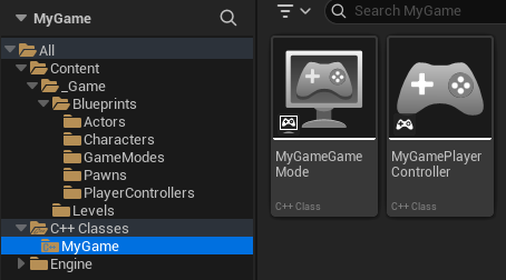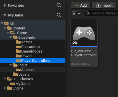 3. İşlem tamamlandığında, "Content\_Game\Blueprints\PlayerControllers" dizininde "BP_MyGamePlayerController" sınıfı oluşturulur.