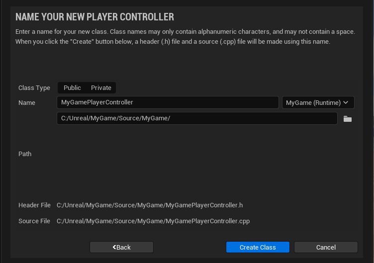 2. Açılan pencerede "Name" satırına "MyGamePlayerController" değerini girdikten sonra "Create Class" butonuna tıklayarak PlayerController sınıfını oluşturalım.