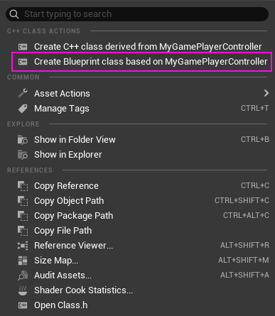 1. "MyGamePlayerController" sınıfına sağ tıkladığımızda açılan menüden, "Create Blueprint class based on MyGamePlayerController" seçeneğine tıklayarak "Add Blueprint Class" penceresini açalım.