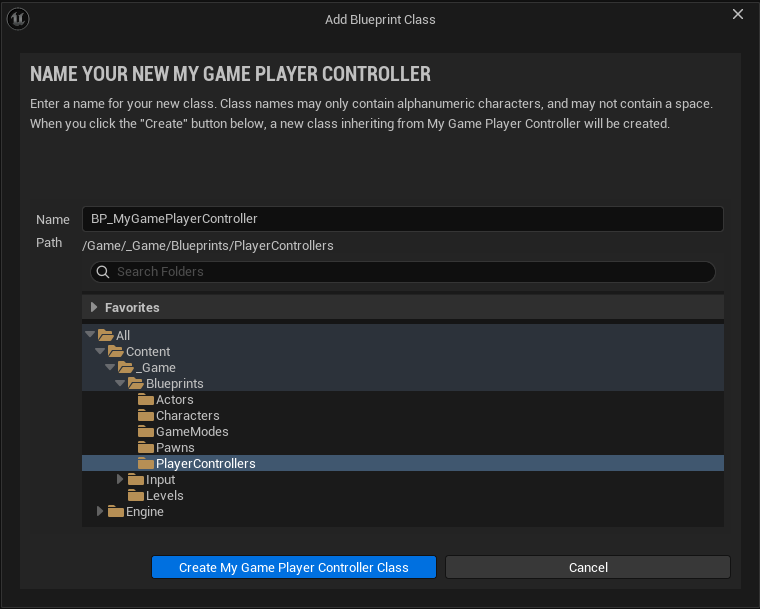2. "Name" satırına "BP_MyGamePlayerController" değerini girdikten ve "Path" bölümünde "Content\_Game\Blueprints\PlayerControllers" dizinini seçtikten sonra "Create My Game Player Controller Class" butonuna tıklayarak Blueprint sınıfını oluşturalım.