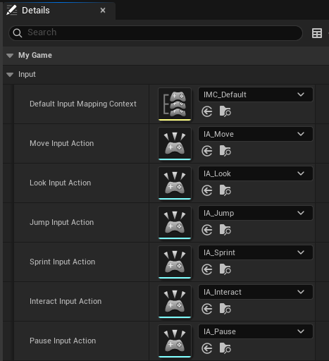 4. "BP_MyGamePlayerController" penceresini açtığımızda, "Details" sekmesinin "Input" satırında aşağıda gösterilen değerlerin otomatik olarak atandığı görülür: