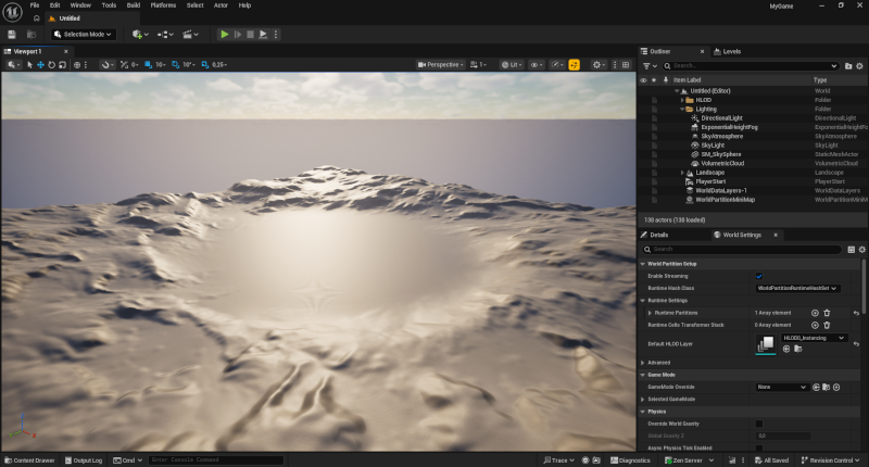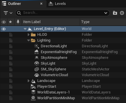 Level'ı çalıştırdığımızda, aşağıda sarı renkle gösterilen 10 adet nesne Outliner'a eklenir.