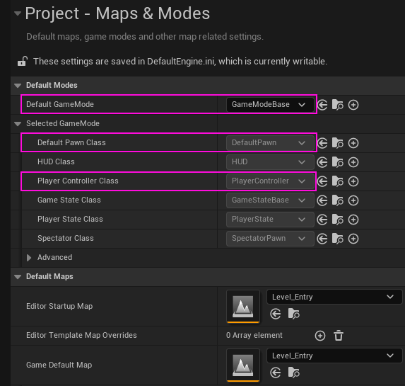 Projenin "Default GameMode", "Default Pawn Class" ve "Player Controller Class" değerleri için, Unreal Engine Editor'ün "Edit - Project Settings" menü seçeneği ile erişilen "Project Settings" penceresinin "Maps & Modes" sekmesinde aşağıdaki gösterilen ön tanımlı ayarlar yer almaktadır:
